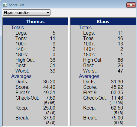 Dart Statisiken : Seit einigen Jahren spielen wir (wenn möglich) einmal die Woche Dart. Dabei nehmen wir die Daten auf und können somit einige Statisiken bzw.  Auswertungen   erstellen über z.B. den 3Dart Average, die High-Outs, First 9 Average, Average "Benötigte Darts" und seit neuem auch die DoppelAus Quote.