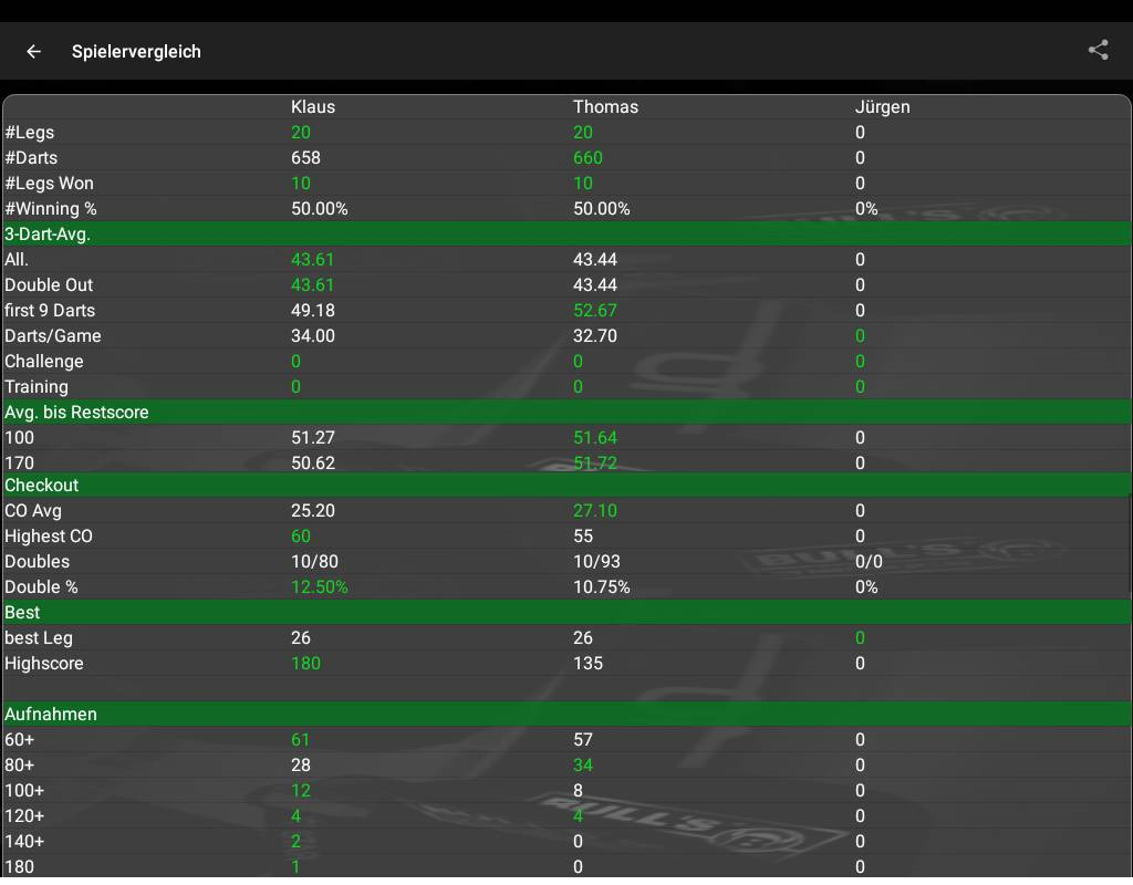 Dart Statisiken : Seit einigen Jahren spielen wir (wenn möglich) einmal die Woche Dart. Dabei nehmen wir die Daten auf und können somit einige Statisiken bzw.  Auswertungen   erstellen über z.B. den 3Dart Average, die High-Outs, First 9 Average, Average "Benötigte Darts" und seit neuem auch die DoppelAus Quote.