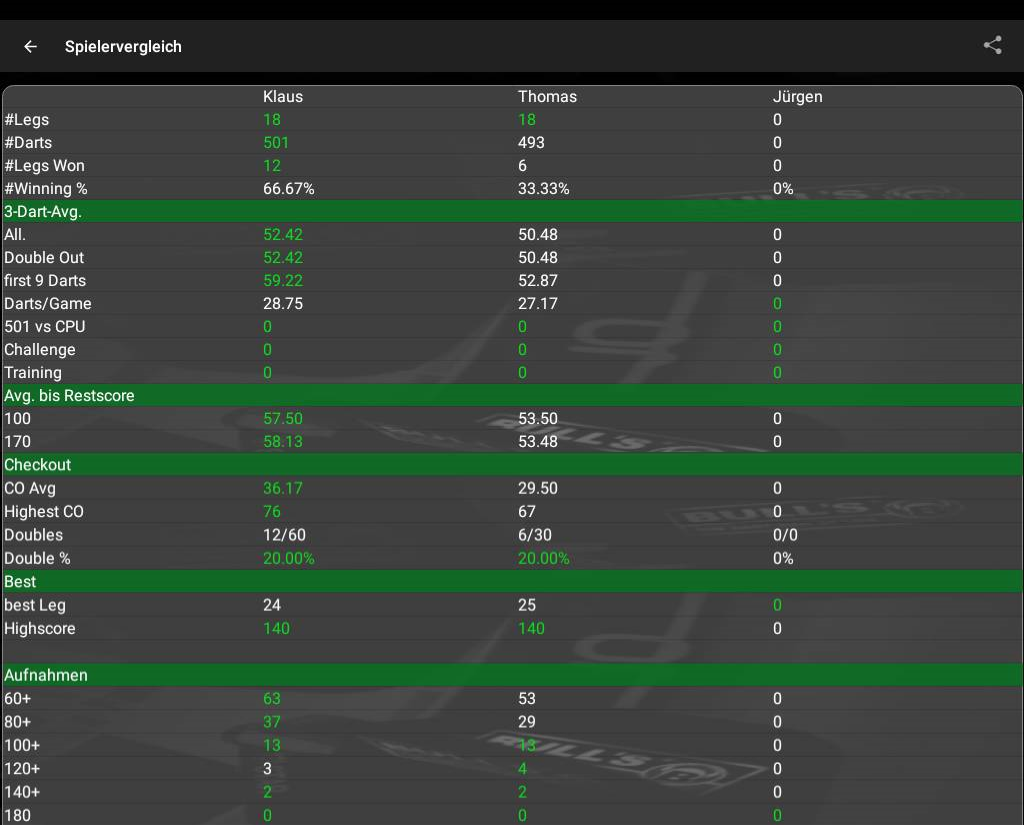Dart Statisiken : Seit einigen Jahren spielen wir (wenn möglich) einmal die Woche Dart. Dabei nehmen wir die Daten auf und können somit einige Statisiken bzw.  Auswertungen   erstellen über z.B. den 3Dart Average, die High-Outs, First 9 Average, Average "Benötigte Darts" und seit neuem auch die DoppelAus Quote.