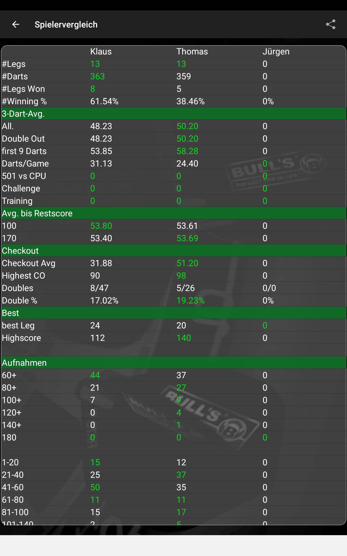 Dart Statisiken : Seit einigen Jahren spielen wir (wenn möglich) einmal die Woche Dart. Dabei nehmen wir die Daten auf und können somit einige Statisiken bzw.  Auswertungen   erstellen über z.B. den 3Dart Average, die High-Outs, First 9 Average, Average "Benötigte Darts" und seit neuem auch die DoppelAus Quote.
