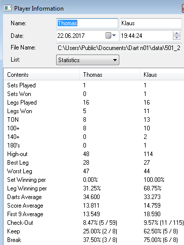 Dart Statisiken : Seit einigen Jahren spielen wir (wenn möglich) einmal die Woche Dart. Dabei nehmen wir die Daten auf und können somit einige Statisiken bzw.  Auswertungen   erstellen über z.B. den 3Dart Average, die High-Outs, First 9 Average, Average "Benötigte Darts" und seit neuem auch die DoppelAus Quote.