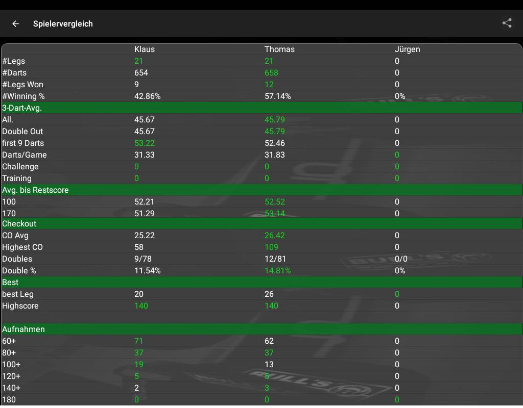 Dart Statisiken : Seit einigen Jahren spielen wir (wenn möglich) einmal die Woche Dart. Dabei nehmen wir die Daten auf und können somit einige Statisiken bzw.  Auswertungen   erstellen über z.B. den 3Dart Average, die High-Outs, First 9 Average, Average "Benötigte Darts" und seit neuem auch die DoppelAus Quote.
