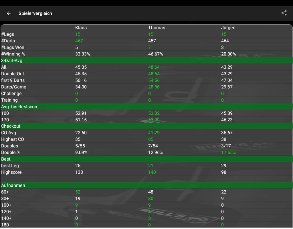 Dart Statisiken : Seit einigen Jahren spielen wir (wenn möglich) einmal die Woche Dart. Dabei nehmen wir die Daten auf und können somit einige Statisiken bzw.  Auswertungen   erstellen über z.B. den 3Dart Average, die High-Outs, First 9 Average, Average "Benötigte Darts" und seit neuem auch die DoppelAus Quote.